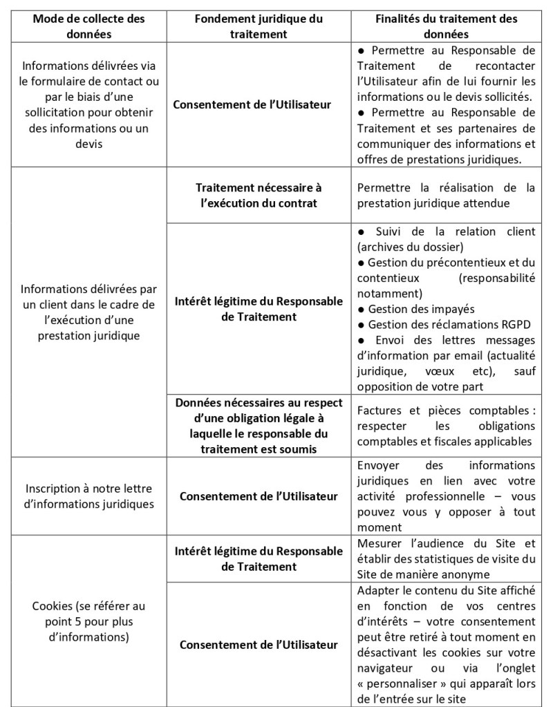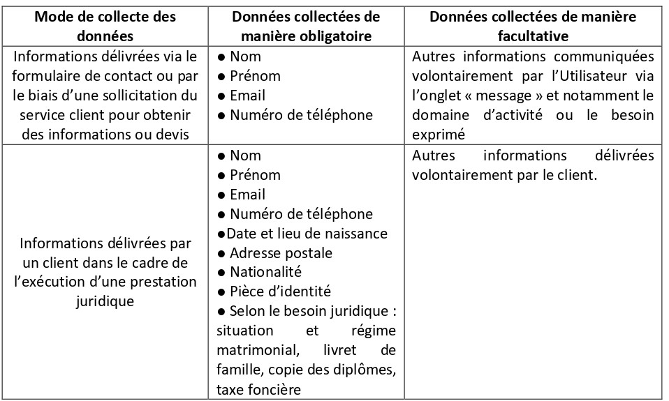 Celles obligatoires entrent dans le cadre de l’exécution des missions juridiques (par exemple, celles relatives à votre situation matrimoniale dans le cadre de la constitution ou de la transmission d’une entreprise), d’autres sont obligatoires afin de se conformer aux règles déontologiques relatives à la profession d’avocat.